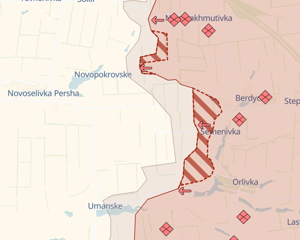 На остальном фронте у россиян был ряд продвижений. Самое крупное из которых - в районе Семеновки на Авдеевском направлении. Также, после длительного затишья, начал двигаться Ореховский участок - там РФ захватила ряд позиций в районе Вербового.