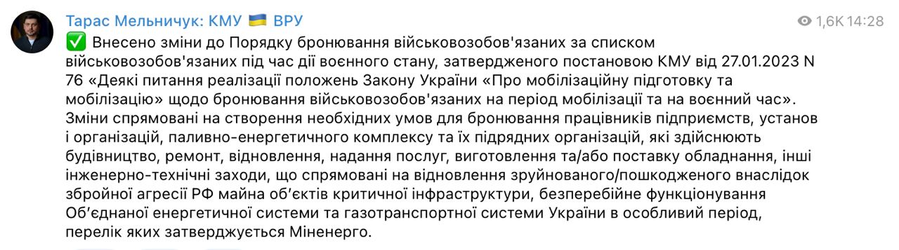 Новые правила касаются работников топливно-энергетического сектора, а также строительства и восстановления критической инфраструктуры, поврежденной в ходе войны.