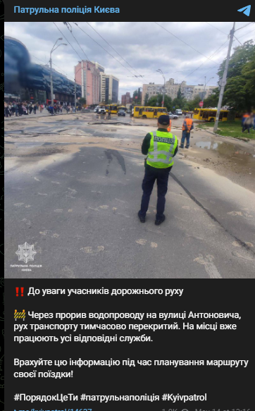 Полиция Киева заявила, что из-за прорыва водопровода на улице Антоновича, движение транспорта временно перекрыто. На месте уже работают все соответствующие службы.