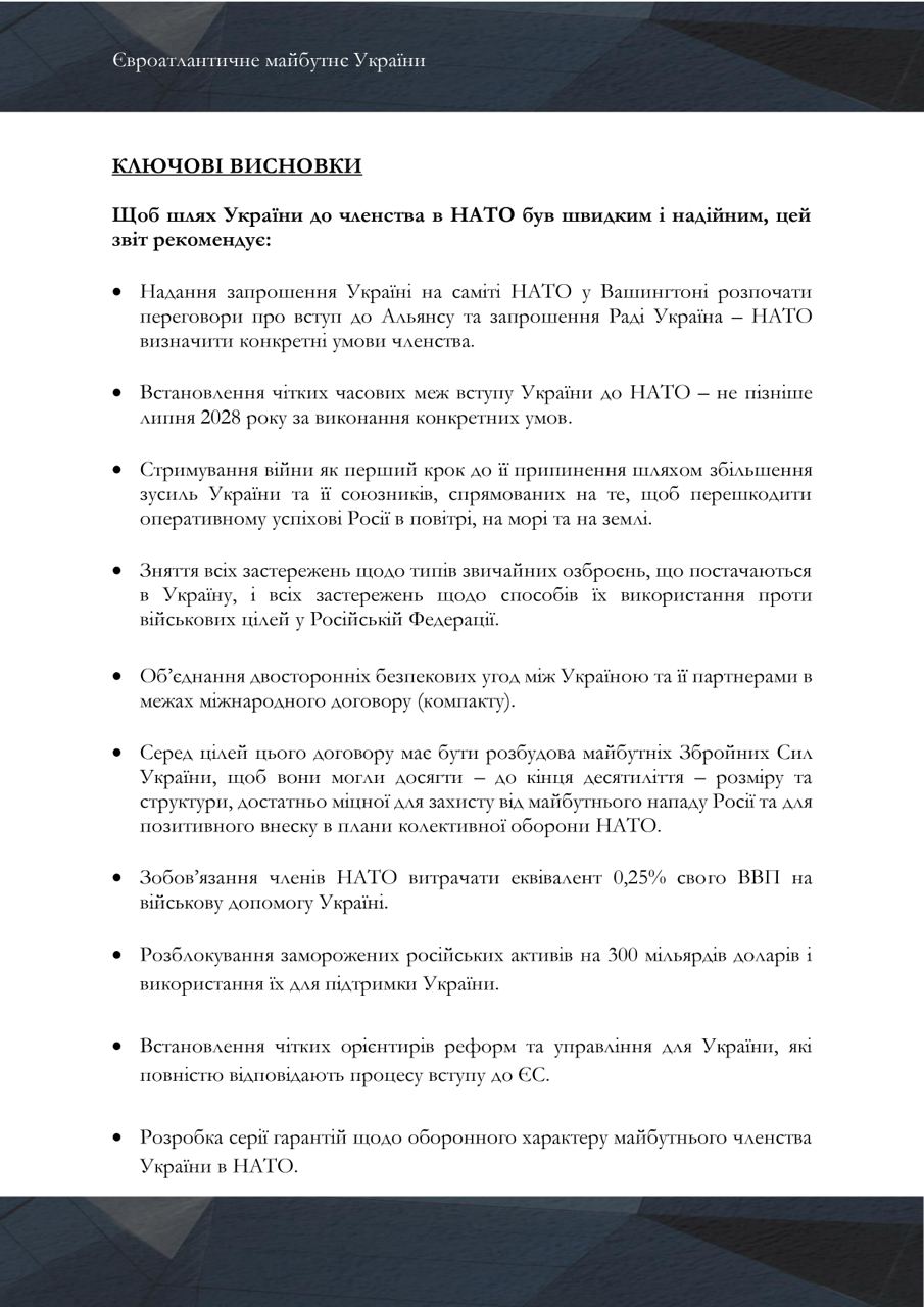 Также в отчете предлагается, чтобы "союзники тратили 0,25% своего ВВП на военную помощь Украине и разблокировали замороженные российские активы на 300 миллиардов долларов для поддержки Украины".