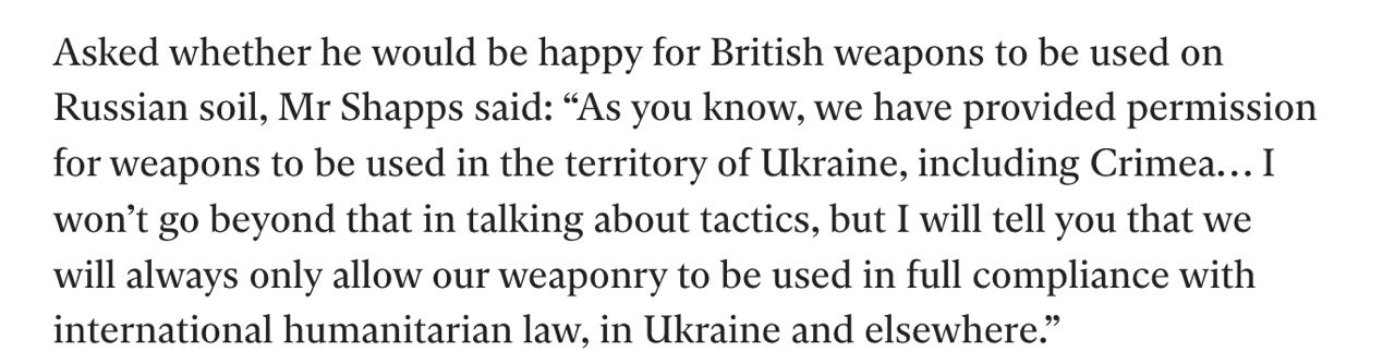 "Как вы знаете, мы предоставили разрешение на использование оружия на территории Украины, включая Крым, который мы считаем неотъемлемой частью Украины", - приводит издание слова Шэппса.
