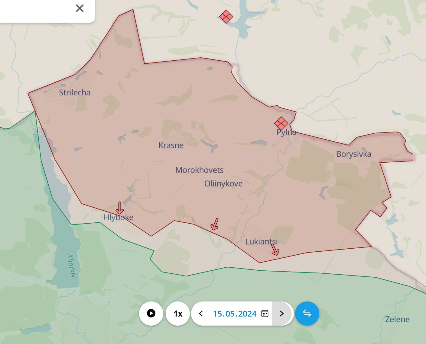На других участках российского прорыва - в направлении Липцов - россияне, как подтверждает Генштаб, захватили Лукьянцы. Минобороны РФ добавляет, что захвачено Глубокое, но Украина этого не подтверждала. На карте паблика Deep State оно наполовину захвачено РФ, а наполовину в серой зоне.