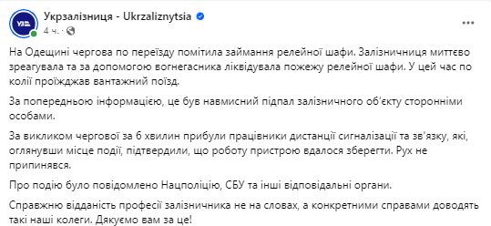 А недавно подобный поджог произошел в Одессе. Неизвестные подожгли резервные аккумуляторы для резервного питания железнодорожных светофоров.