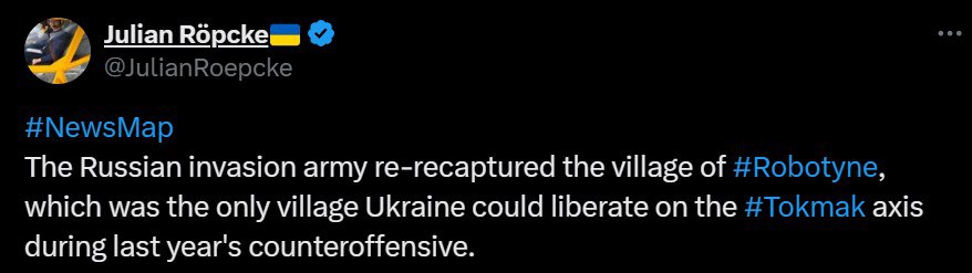 Репке напоминает, что Работино "было единственным селом, которое Украина смогла освободить в направлении Токмака во время прошлогоднего контрнаступления".