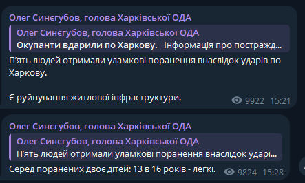 По данным главы Харьковской ОВА Олега Синегубова, "пять человек получили осколочные ранения в результате ударов по Харькову".
