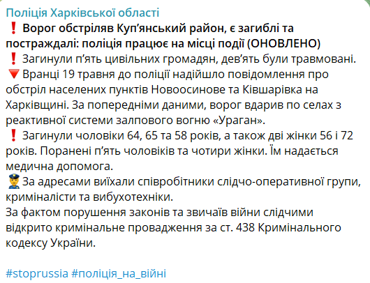 14:49 Сегодня утром российские военные обстреляли Новоосиново и Ковшаровку Купянского района. Погибли пять мирных жителей, еще девять травмированы.