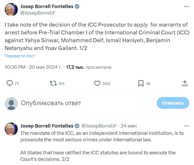 "Я принимаю к сведению решение прокурора МУС ходатайствовать о выдаче ордеров на арест в Палате предварительного производства I Международного уголовного суда (МУС) против Яхьи Синвара, Мохаммеда Дейфа, Исмаила Хании, Биньямина Нетаньяху и Йоава Галланта. Мандат МУС как независимого международного учреждения заключается в преследовании наиболее тяжких преступлений согласно международному праву. Все государства, ратифицировавшие устав МУС, обязаны выполнять решения суда", – написал Боррель.