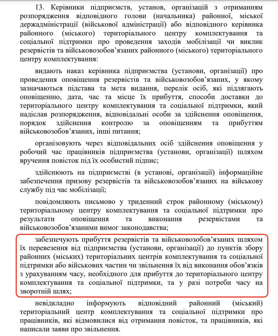 "Руководители предприятий, учреждений, организаций ... обеспечивают прибытие резервистов и военнообязанных путем их перевозки от предприятия (учреждения, организации) к пунктам сбора районных (городских) территориальных центров комплектования и социальной поддержки или воинских частей или освобождение их от выполнения обязанностей с учетом времени, необходимого для прибытия в территориальный центр комплектования и социальной поддержки, и в случае необходимости времени на