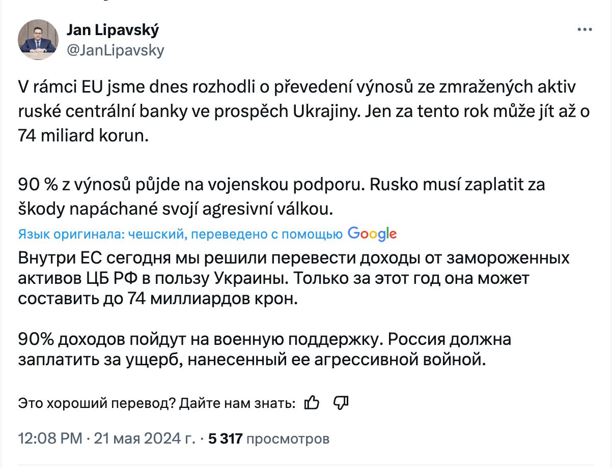 13:21 Евросоюз принял решение о передаче Украине средств, полученных от замороженных российских активов, сообщает глава МИД Чехии Липавский в Х.