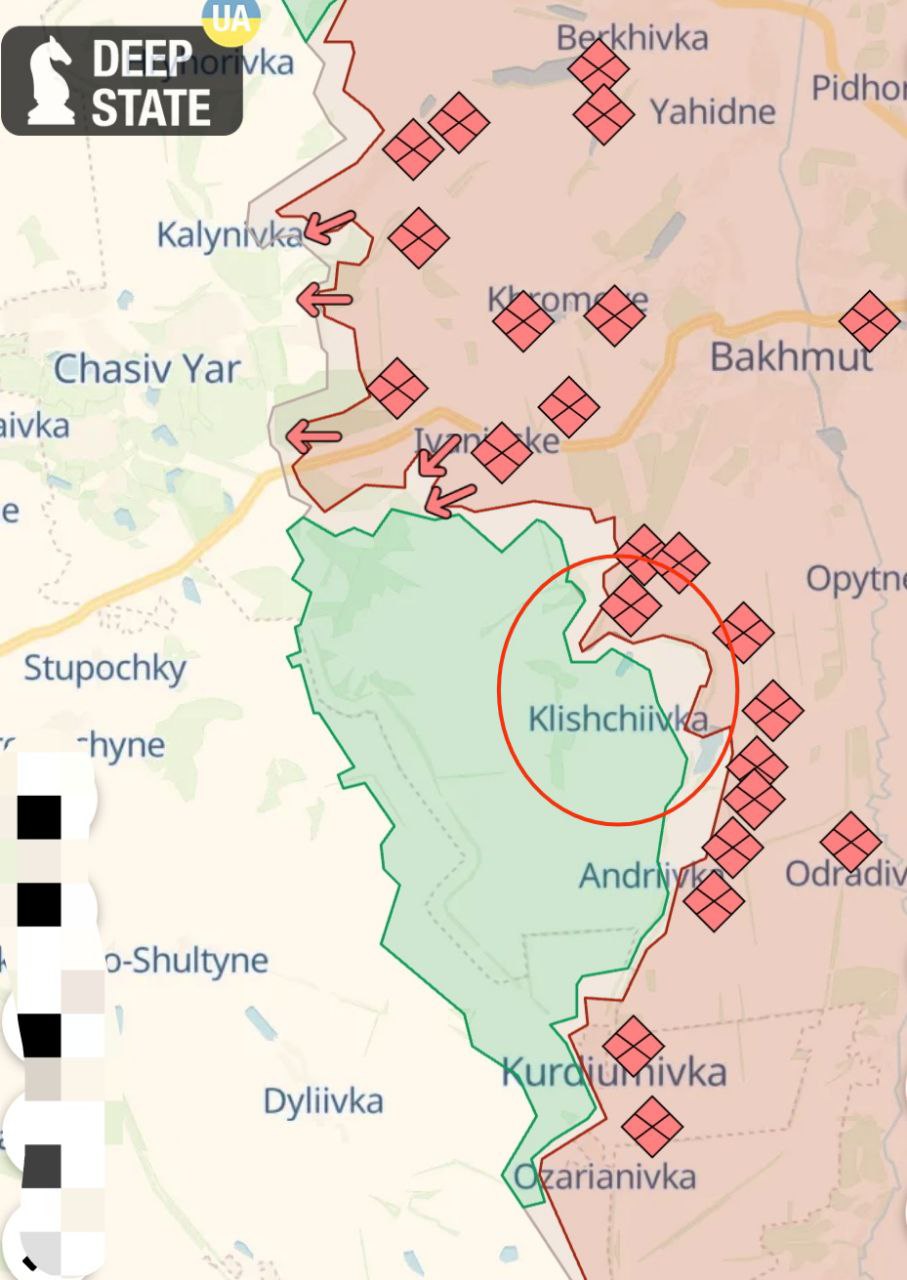 Район Клещеевки представляет собой крупное вклинение в российские позиции к югу от Бахмута и Часова Яра.