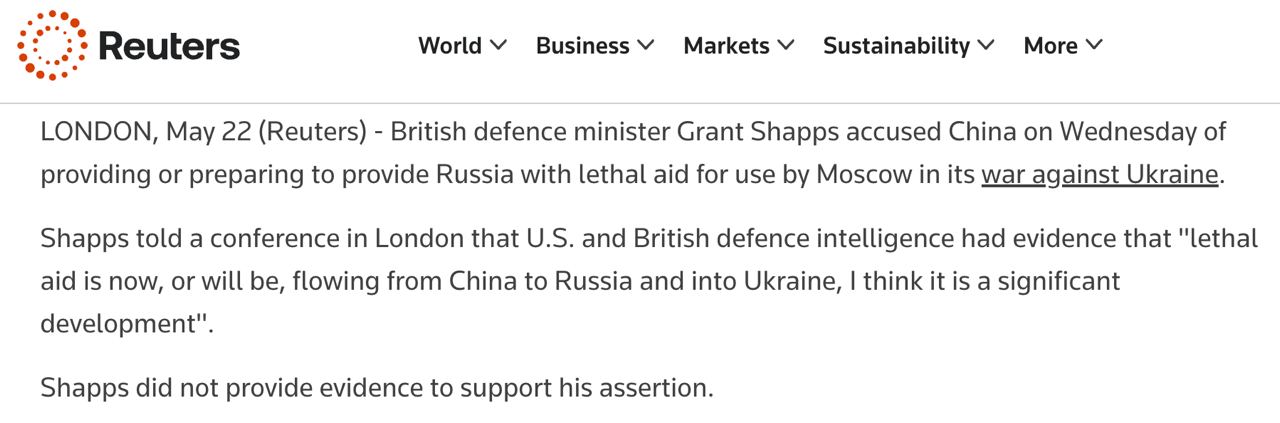"Шэппс заявил на конференции в Лондоне, что у американской и британской военной разведки есть доказательства того, что "летальная помощь уже поступает или будет поступать из Китая в Россию и в Украину", - пишет Reuters.