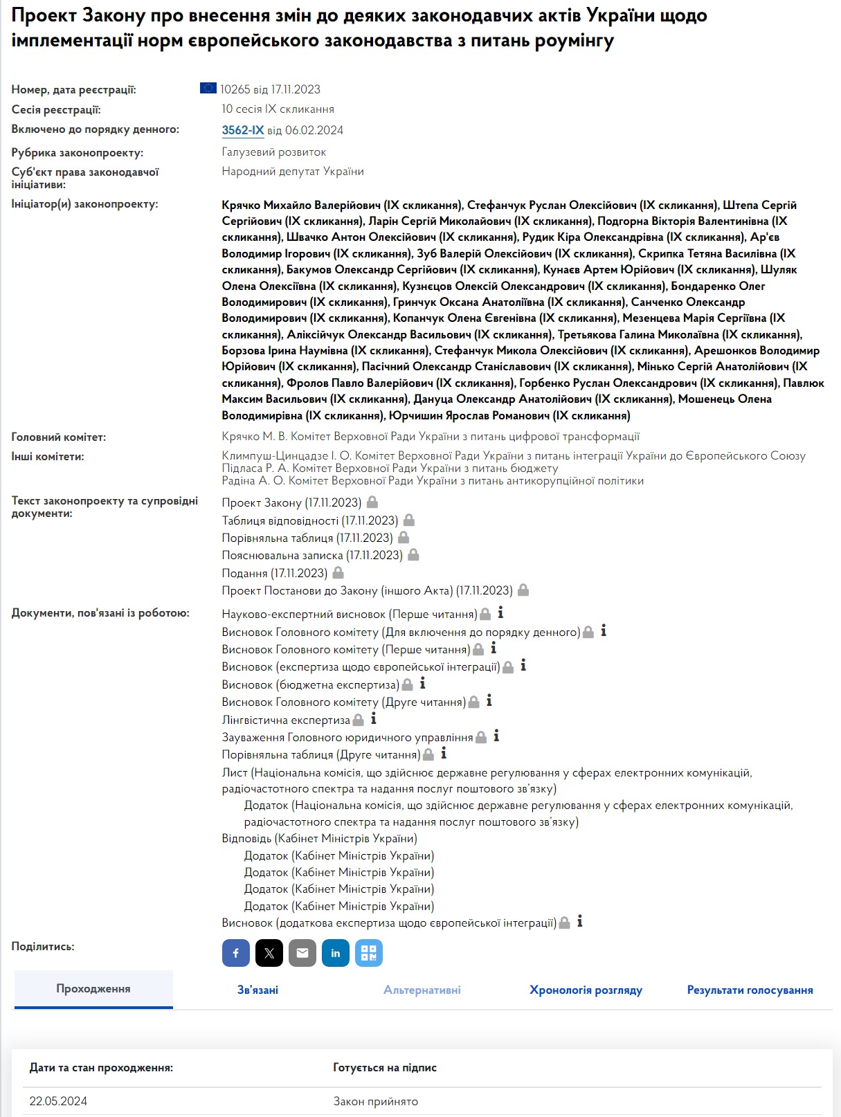 Об этом свидетельствует статус в карточке документа на сайте парламента. Полное название проекта - "О внесении изменений в некоторые законодательные акты Украины об имплементации норм европейского законодательства по вопросам роуминга".