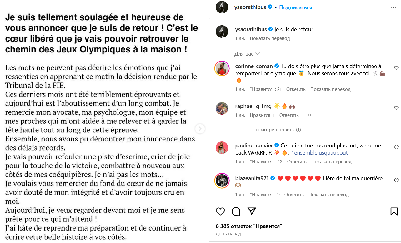 "Словами не могу описать эмоции, которые я испытала, узнав о решении, вынесенном трибуналом FIE. Последние несколько месяцев были ужасно напряженными, и сейчас наступила кульминация долгой борьбы", - написала рапиристка, поблагодарив адвокатов, команду и близких.