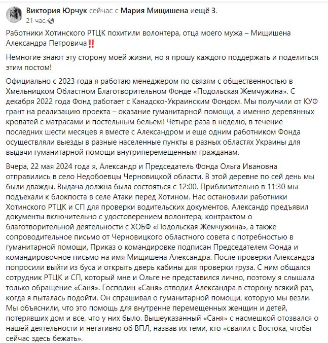 Сотрудники Хотинского РТЦК Черновицкой области похитили волонтера Александра Мищишена.