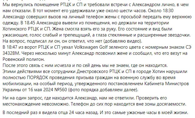 Далее, рассказывает Виктория, Александр "во избежание еще большего морального и физического издевательства" согласился поехать в ТЦК, после чего связь с ним пропала. В дальнейшем Мищишену удалось связаться с родными, и он сообщил, что его везут на Ровенский полигон.