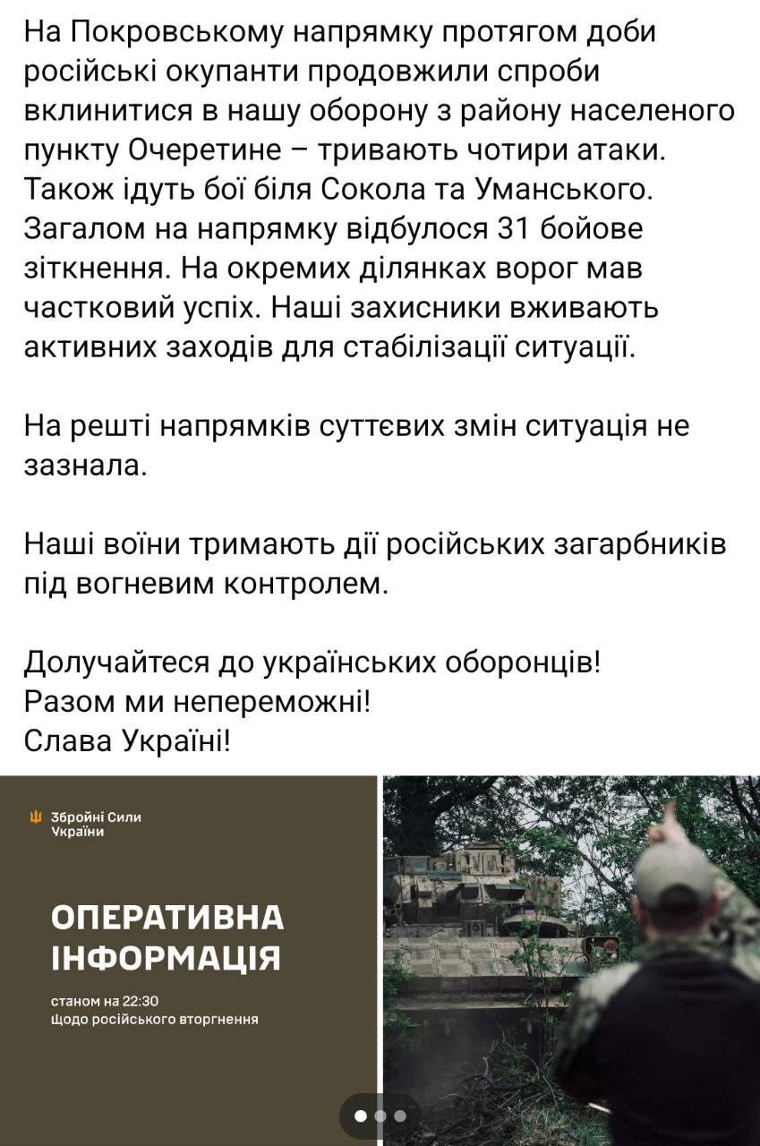 23:21 Генштаб ВСУ заявил о "частичном успехе" российских войск на Покровском направлении.