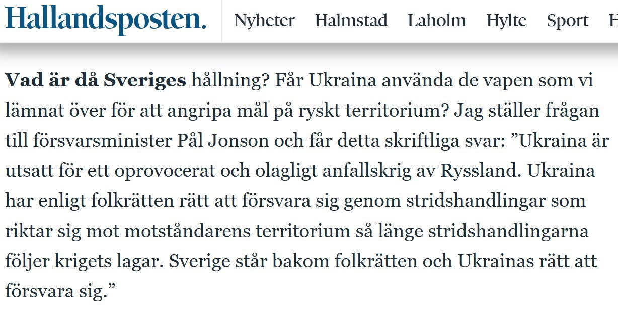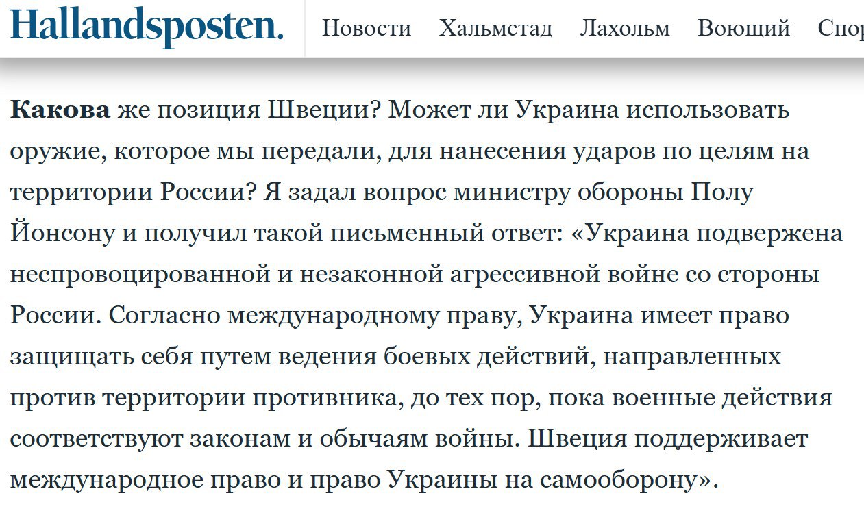 Украинские телеграм-каналы сообщают, что Швеция дала Украине право наносить своим оружием удары по России. При этом они ссылаются на статью в газете Hallandsposten.