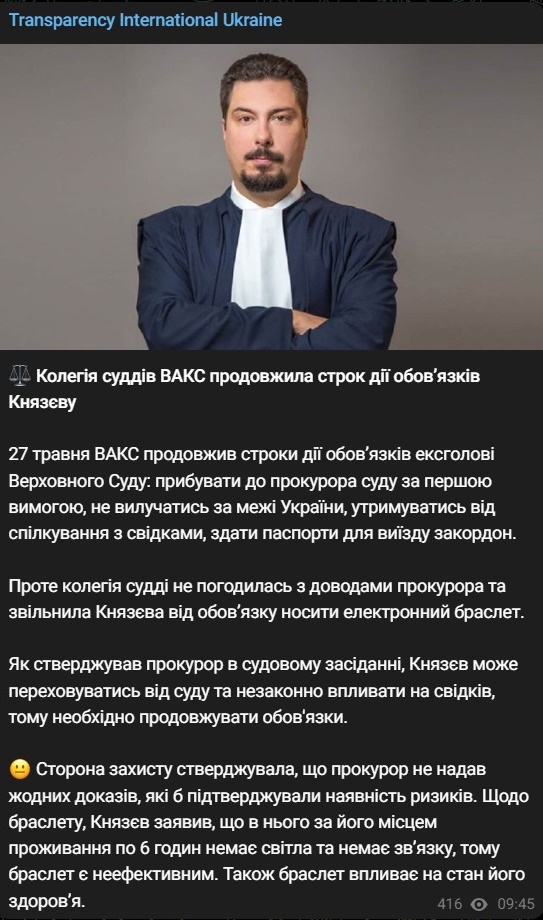 Сегодня, 27 мая, Высший антикоррупционный суд продлил срок действия обязанностей, наложенных на экс-главу Верховного Суда Всеволода Князева, подозреваемого в получении 2,7 млн долларов взятки. Но с него сняли электронный браслет.