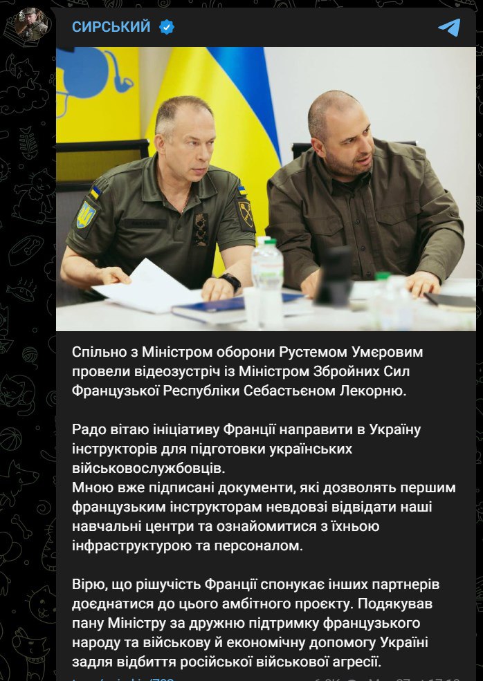 "Приветствую инициативу Франции направить в Украину инструкторов для подготовки украинских военнослужащих. Мною уже подписаны документы, которые позволят первым французским инструкторам посетить наши учебные центры и ознакомиться с их инфраструктурой и персоналом", – сообщил главком.