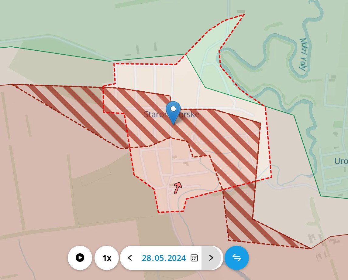 Судя по обновленной карте ресурса Deep State, российские войска контролируют южную и центральную части Старомайорского. Северные окраины находятся в серой зоне.