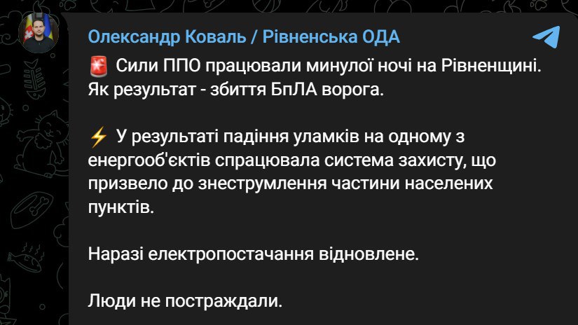 08.55 В Ровенской области из-за атаки беспилотника отключался свет в ряде населенных пунктов. Об этом заявил губернатор Александр Коваль.