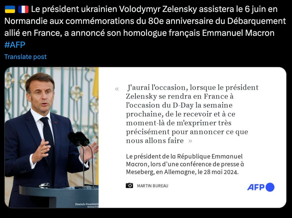 09.25 Макрон заявил, что "объявит" Зеленскому некие планы на встрече в Нормандии 6 июня.