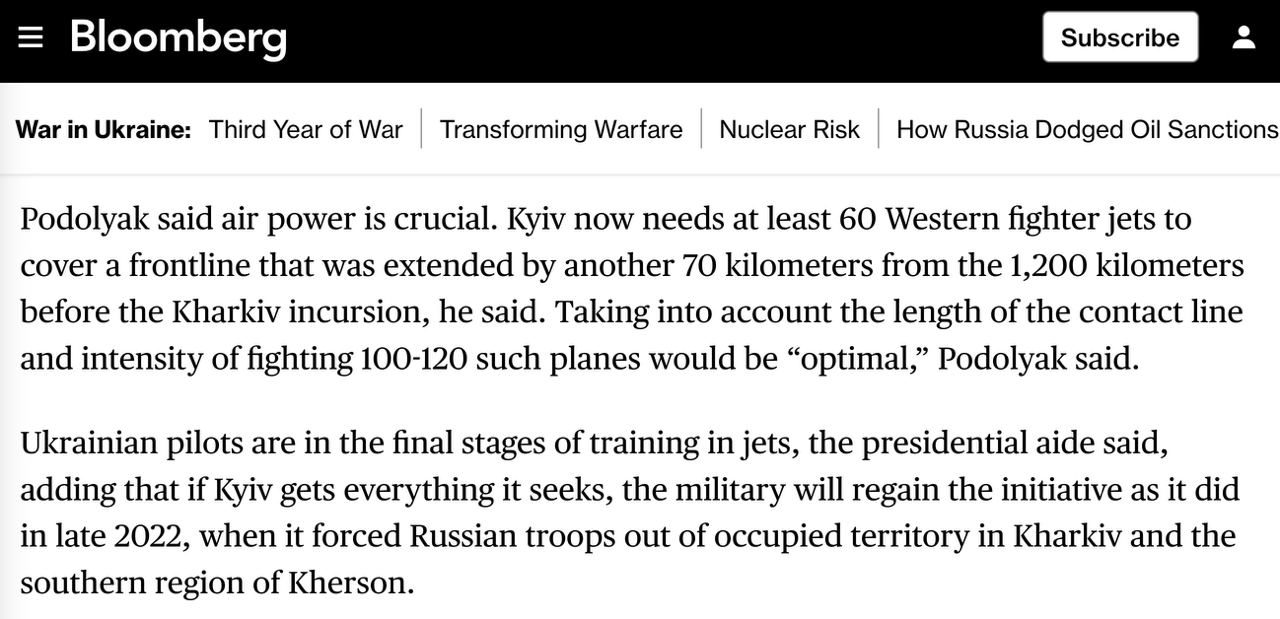 17:07 Украине нужны не меньше 60 западных истребителей для защиты фронта, заявил советник главы ОП Подоляк в комментарии Bloomberg.