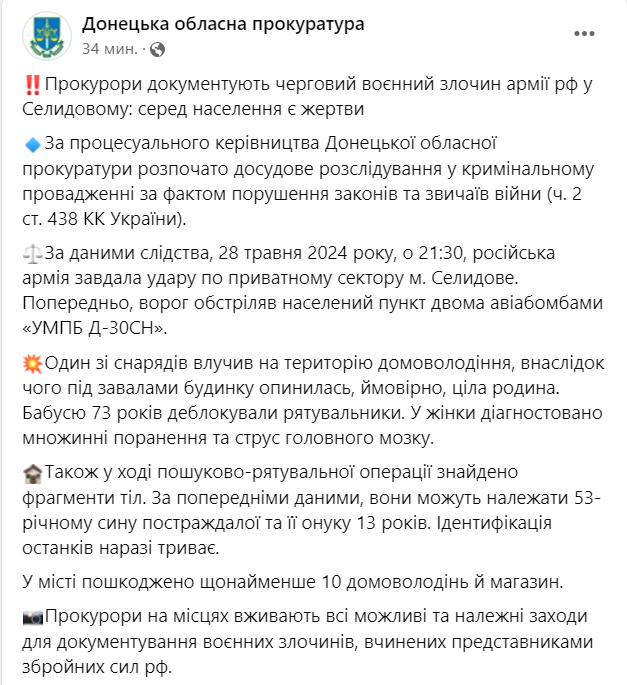 По данным следствия, 28 мая 2024 года, в 21:30, российская армия нанесла удар по частному сектору г. Селидово. Предварительно враг обстрелял населенный пункт двумя авиабомбами "УМПБ Д-30СН".