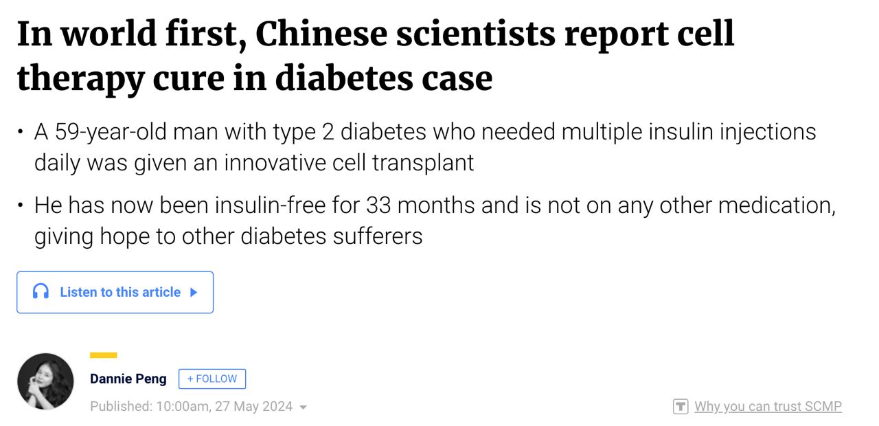 Китайцы модифицировали стволовые клетки поджелудочной железы мужчины и провели трансплантацию, после чего организм начал самостоятельно вырабатывать инсулин.
