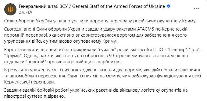 "Сегодня ночью Силы обороны Украины нанесли удар ракетами ATACMS по Керченской паромной переправе… В результате поражения существенные повреждения получили два парома, которые осуществляли железнодорожные и автомобильные перевозки. Один из них сел на мель, чем заблокировал функционирование всей Керченской переправы", – говорится в сообщении генштаба.