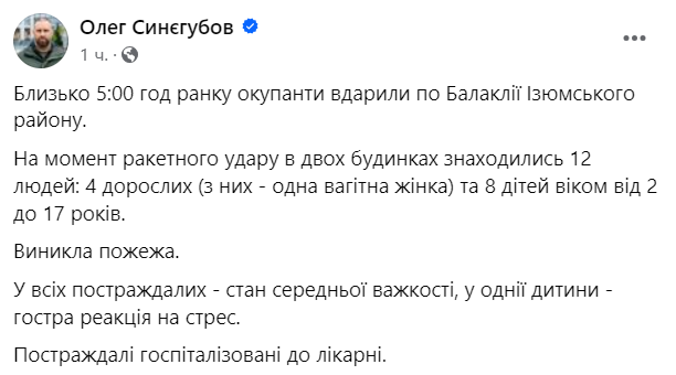 Сегодня утром российские войска ударили по Балаклее Изюмского района. Пострадали 12 человек, среди них восемь детей.