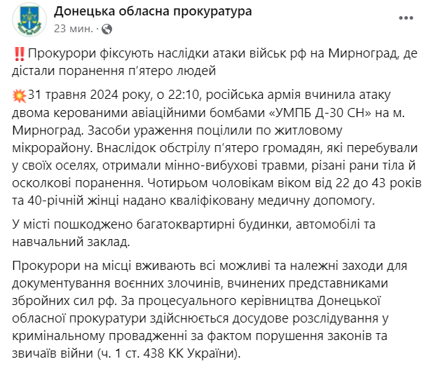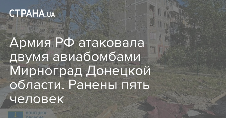 Вчера вечером российская армия атаковала двумя управляемыми авиационными бомбами Мирноград Донецкой области. Ранены пять человек, пострадало учебное заведение.