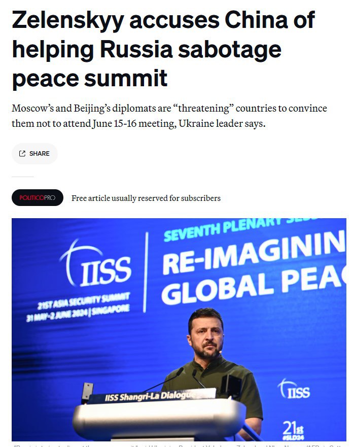 "Китай является инструментом в руках путина. Китай работает над тем, чтобы другие страны не приезжали на саммит мира", - заявил Зеленский.