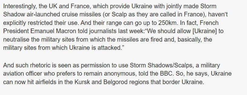 Франция дала разрешение Украине на использование своих дальнобойных ракет Storm Shadows/Scalps для ударов по аэродромам в Курской и Белгородской областях.