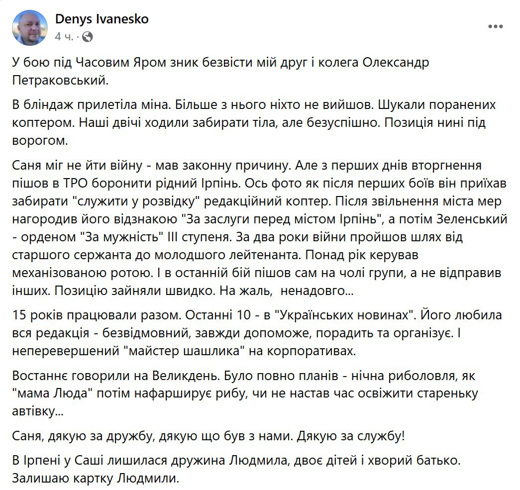 "В бою под Часовым Яром пропал без вести мой друг и коллега Александр Петраковский. В блиндаж прилетела мина. Больше из него никто не вышел. Искали раненых коптером. Наши дважды ходили уносить тела, но безуспешно. Позиция сейчас находится под врагом. Саня мог не идти на войну - имел законную причину. Но с первых дней вторжения пошел в ТРО защищать родной Ирпень", - написал Иванеско.
