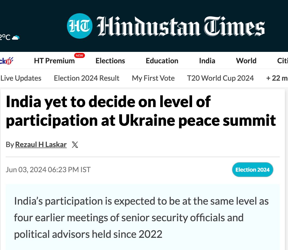 Как говорится в заметке, участие Индии в конференции в Швейцарии будет на том же уровне, что и на четырех предыдущих встречах по украинскому вопросу, состоявшихся в Копенгагене, Джидде, Мальте и Давосе с 2022 года. На большинстве этих саммитов страну представлял секретарь министерства иностранных дел или заместитель советника по национальной безопасности. Однако издание уточнило, что хотя советник по национальной безопасности Аджит Доваль присутствовал на встрече в Джидде в августе 2023 года, он вряд ли поедет в Швейцарию.