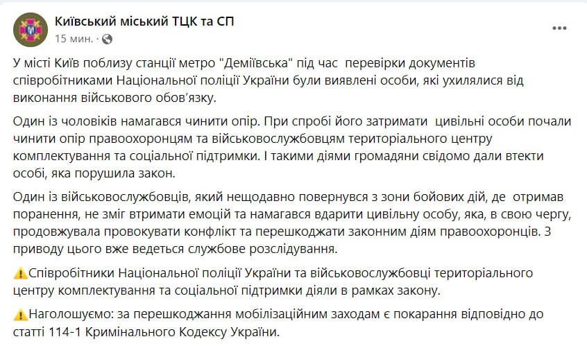 В сообщении ТЦК в Фейсбуке говорится, что возле станции метро "Демеевская" во время проверки документов сотрудники полиции обнаружили "уклоняющихся от исполнения воинского долга лиц". Как заявляет ТЦК, один из мужчин начал сопротивляться, а при попытке его задержать противодействовать правоохранителям и военкомам начали уже гражданские лица, в результате чего мужчина смог сбежать.