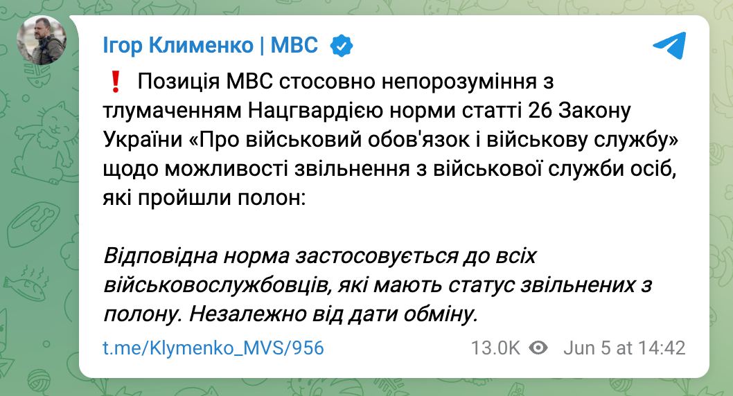 "Соответствующая норма применяется ко всем военнослужащим, имеющим статус освобожденных из плена. Независимо от даты обмена", - пишет глава МВД.