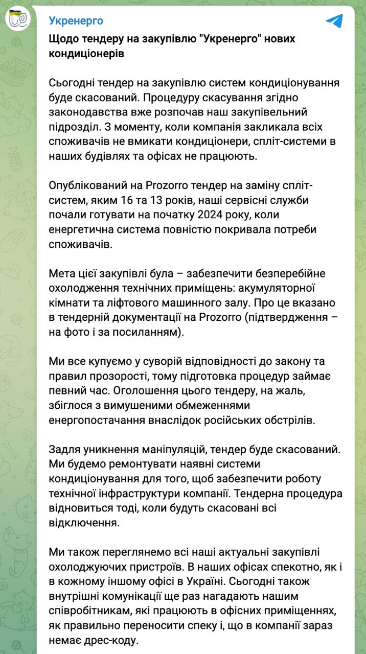 После вызванного тендером скандала компания сегодня заявила, что отменит тендер, а кондиционерами не пользуется наравне со всеми. В "Укрэнерго" также объяснили, что хотели заменить старые устройства, которым по 13-16 лет, и начали процедуру закупки еще во времена, когда света хватало. Но теперь в компании решили обойтись ремонтом старой техники.