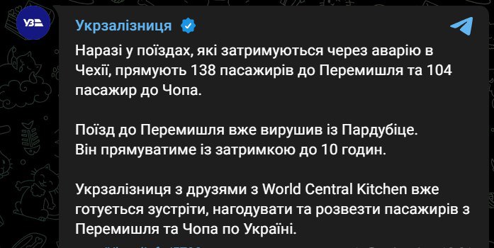 Вскоре после публикаций о происшествии "Укрзализныця" сообщила, что в украинских поездах, которые задерживаются из-за крушения, 138 пассажиров ехали в Перемышль и 104 - в Чоп. Поезд в Перемышль уже отправился из Пардубице, где произошла авария. Он будет следовать с задержкой до 10 часов.