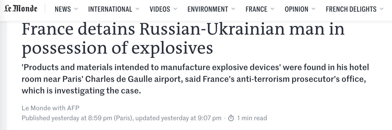 Le Journal du Dimanche сообщает, что мужчину подозревают в намерении взорвать военное оборудование, которое Франция отправляет в Украину.