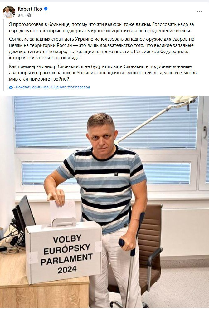Также, проголосовавший на выборах в Европарламент, несмотря на ранение, Фицо заявил, что отдал голос "за евродепутатов, которые поддержат мирные инициативы, а не продолжение войны".