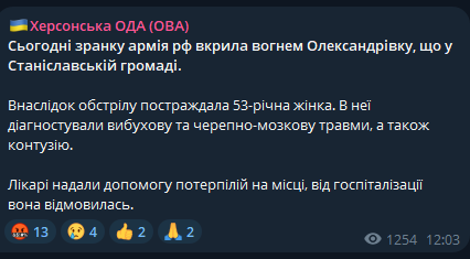 Российские войска обстреляли Станиславскую громаду Херсонской области. Пострадала женщина