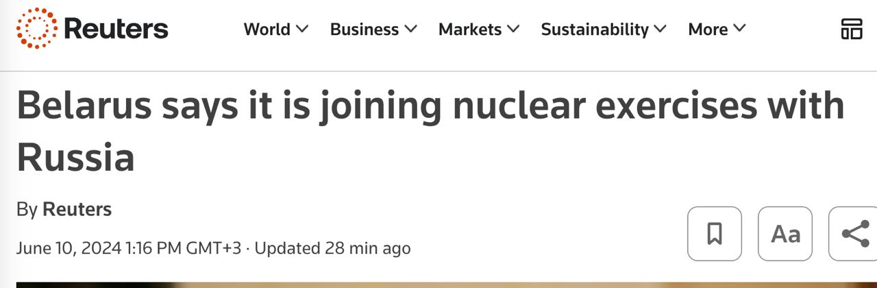 Такое мнение высказывает Reuters, комментируя новый этап тактических ядерных учений, который начался в союзной РФ Беларуси.