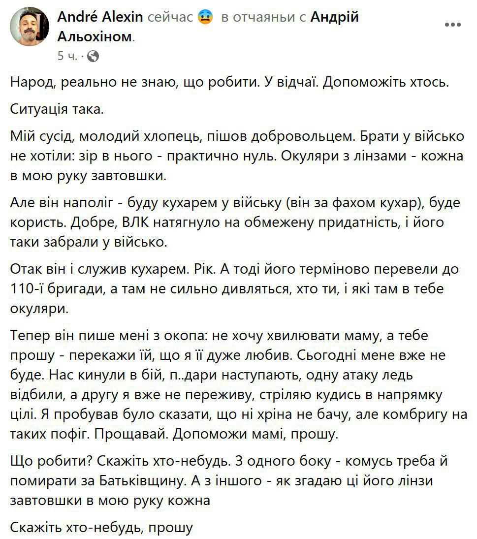 "Мой сосед, молодой парень, пошел добровольцем. Брать в армию не хотели: зрение у него – практически ноль. Очки с линзами – каждая в мою руку толщиной. Но он настоял – буду поваром в войсках (он по специальности повар), будет польза. Благо, ВВК натянуло на ограниченную пригодность, и его забрали в армию. Так он и служил поваром. Год. А тогда его срочно перевели в 110-ю бригаду, а там не сильно смотрят, кто ты, и какие там у тебя очки", – написал Алехин.