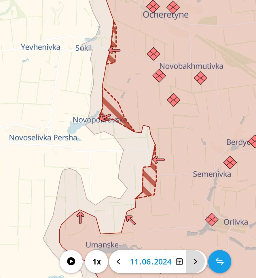 О том, что Покровское направление - наиболее тяжелое для ВСУ, пишут и украинские военные паблики. Продвижение россиян тут идет ежедневно. По данным Deep State, россияне подошли ближе к селу Сокол и продвинулись в Новопокровском (российские паблики утверждают, что Новопокровское уже взяли).