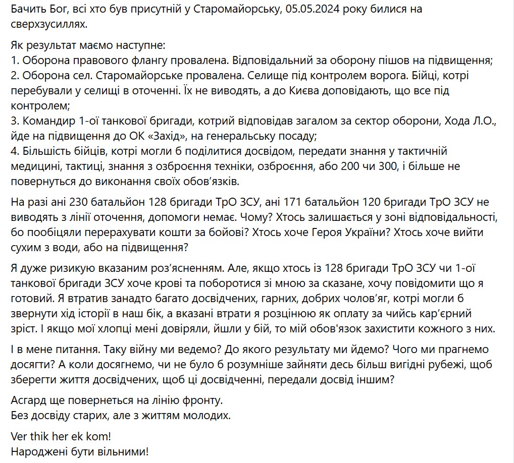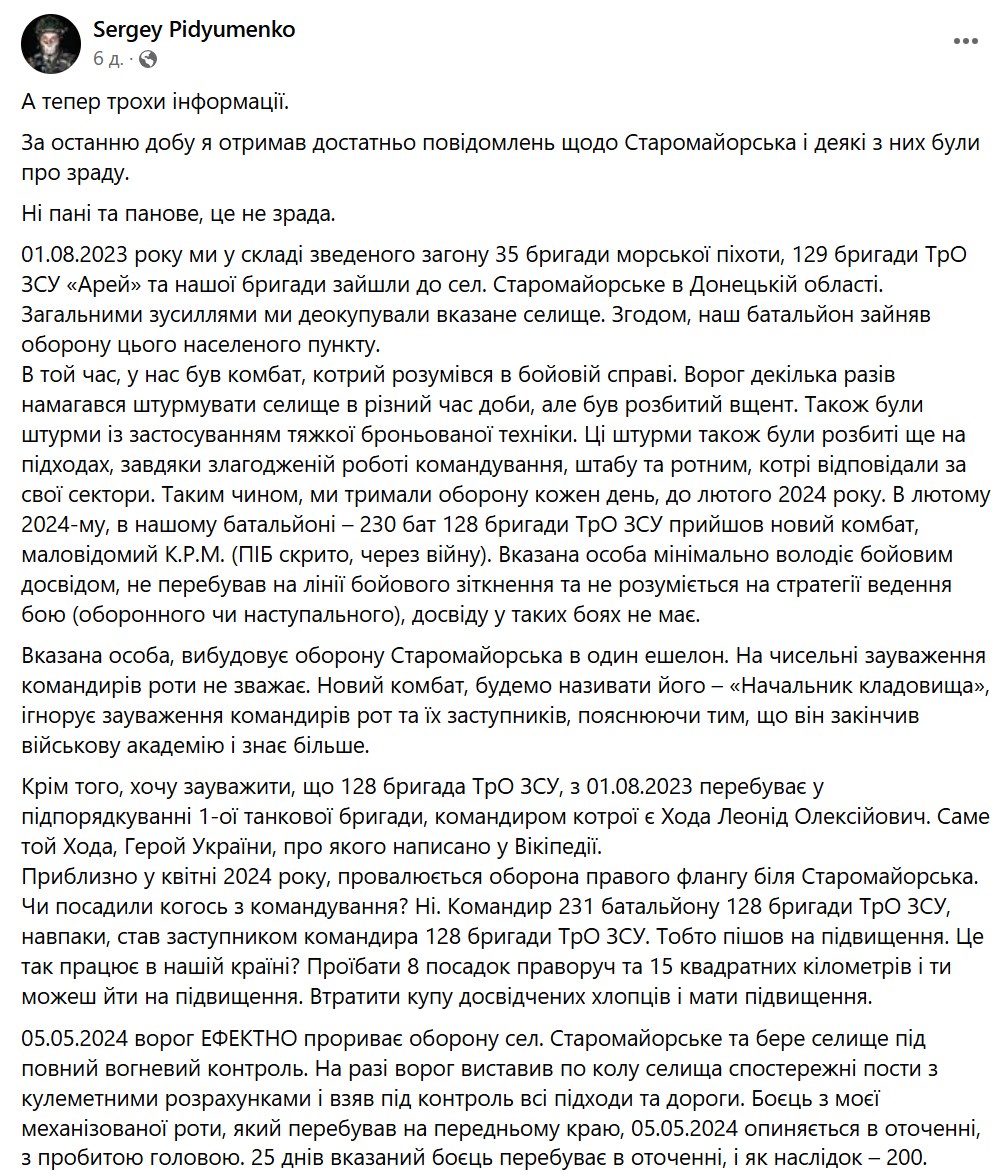 "Оборона Старомайорского провалена. Поселок под контролем врага. Бойцы, находившиеся в поселке, в окружении. Их не выводят, а в Киев докладывают, что все под контролем", - писал он.