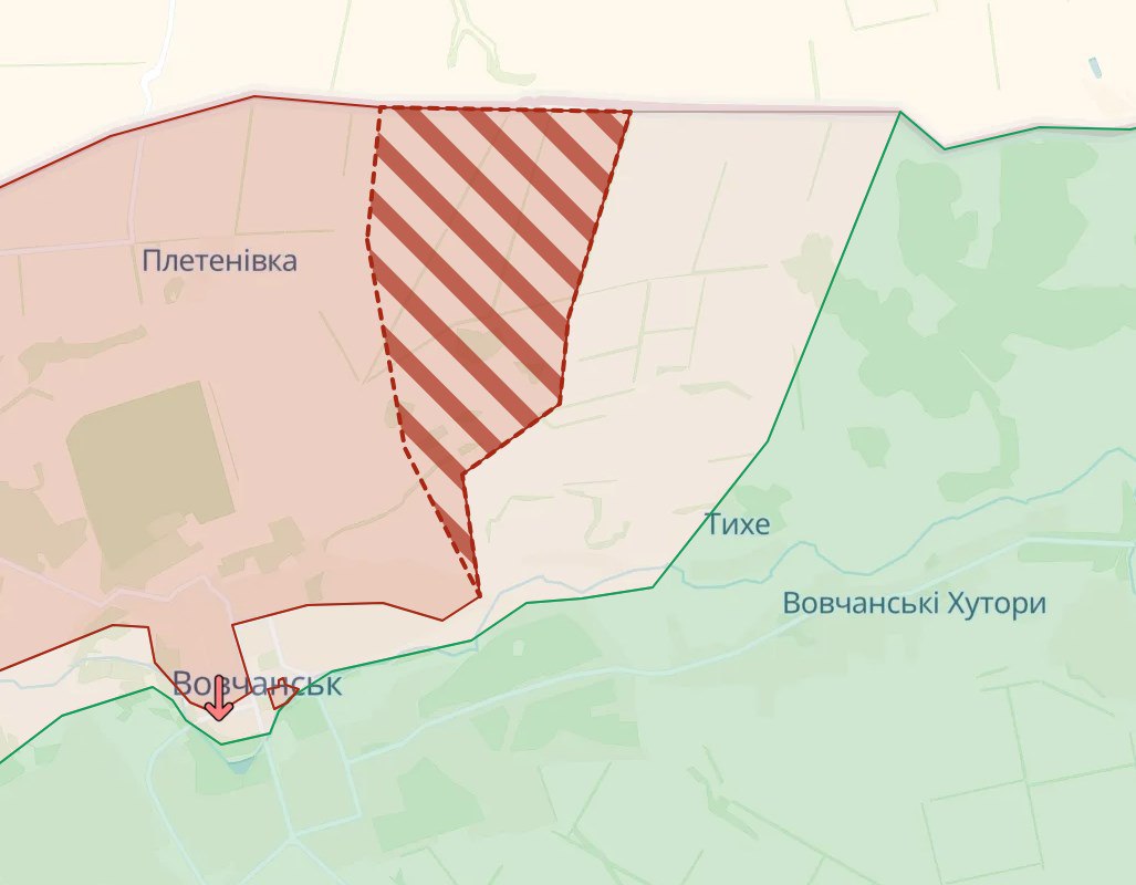 Территория, которая раньше обозначалась как "серая зона" к северо-востоку от Волчанска, теперь находится под российским контролем (заштрихованная область на карте).