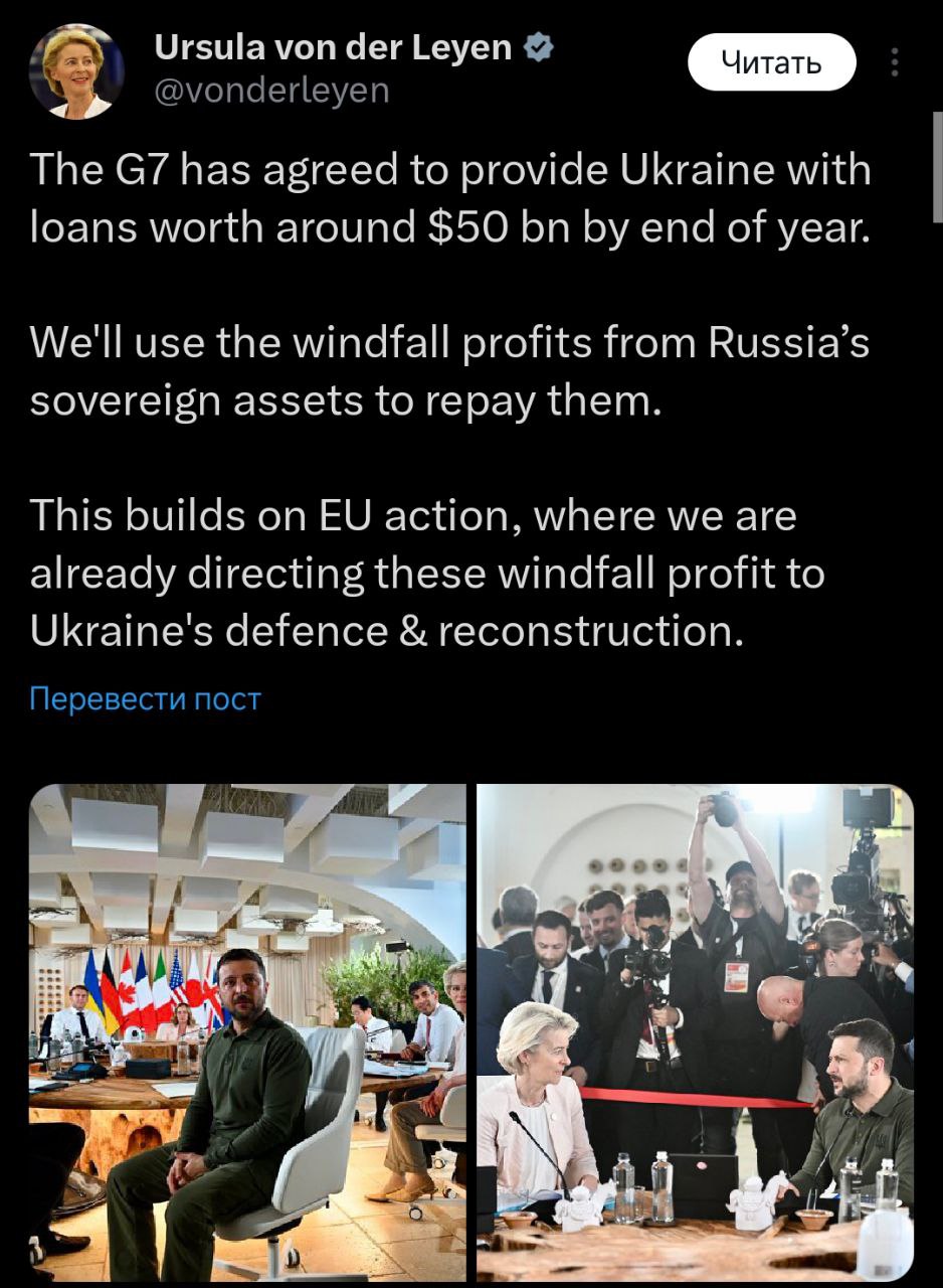 "G7 договорилась предоставить Украине кредиты на сумму около $50 млрд до конца года. Мы будем использовать непредвиденную прибыль от суверенных активов России для их погашения. Это основано на действиях ЕС, и мы уже направляем эту непредвиденную прибыль на оборону и восстановление Украины", - сказано в публикации.
