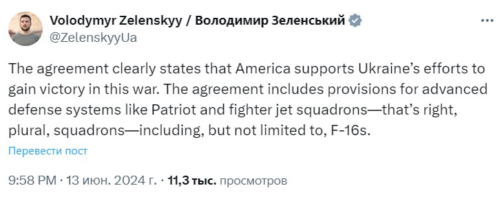 Между тем Зеленский в Х заявил, что по соглашению о безопасности США должны предоставить Украине "эскадрильи истребителей".